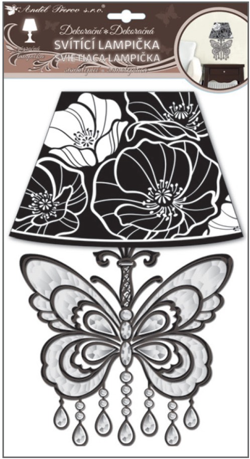 Lampička samolepicí svítící LED motýl 31cm Vhodná na stěny a jiné hladké plochy. Návod: 1. Před nalepením sundejte krycí fólii a odstraňte pojistku 2. Přilepte na suché a rovné místo 3. Při doteku se lampička rozsvítí a po chvíli sama zhasne. 4. Životnost baterií je cca 600 hodin